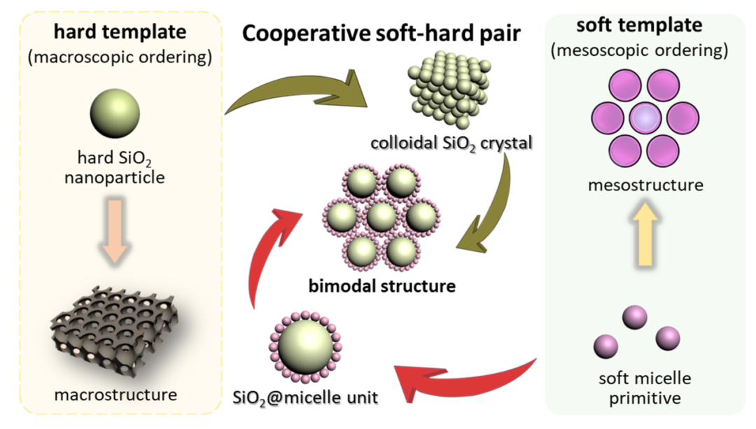 The research reports a cooperative soft-hard hierarchic assembly strategy combining soft micel (tri-block surfactant F127 polydopamine) and hard rigid particles (colloid SiO2), which avoids the current non-conformity of soft micel assembly in metastable state, realizes integrated assembly and preparation of bimodal ordered porous structure of multiple mesoscopic units, and yields products with highly controllable and ordered bimodal regularity and excellent porosity.