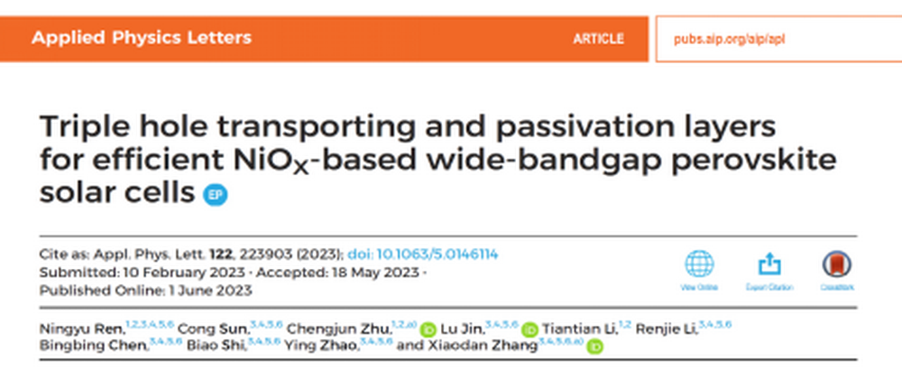 In addition, the research team of Prof. Zhu Chengjun has also made progress in the research on nickel oxide -based perovskite solar cells. The research result concerned has been published in the international top journal in physics-Applied Physics Letters. The result is titled “Triple hole transporting and passivation layers for efficient NiOX-based wide-bandgap perovskite solar cells”(URL of the article: https://pubs.aip.org/aip/apl/article/122/22/223903/2893945/Triple-hole-transporting-and-passivation-layers).