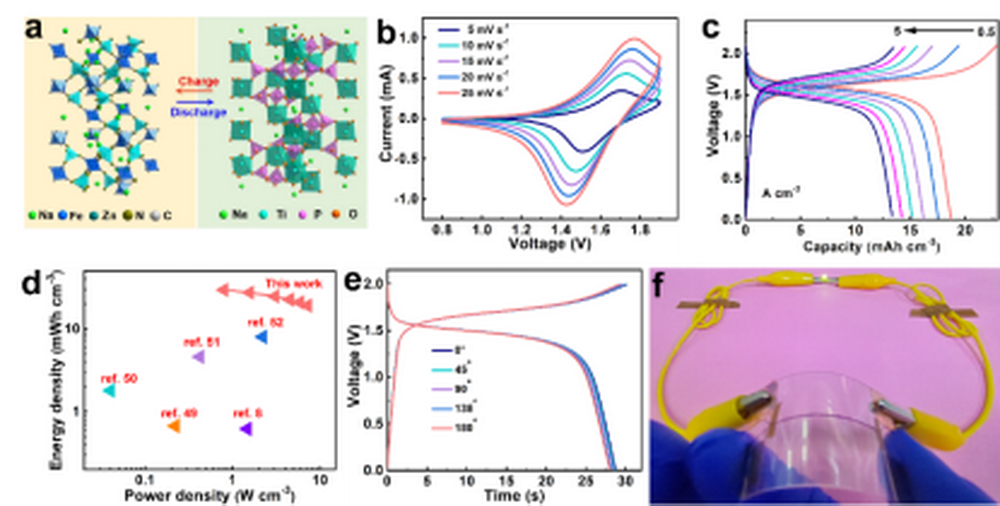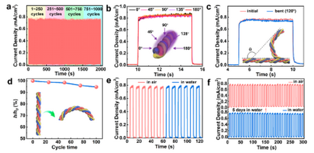 For photodetection, the sol–gel electrolyte is the insulating layer that effectively encloses the electrodes and ensures optimal carrier transmission while also preventing short circuits between electrodes with a large area contact. In wearable applications, FPD shows favorable resistance to complicated physical deformation and excellent stability for optical signal delivery in wearable applications(With a bending angle of 120°, it maintains approximately 95.24% of the initial value after 100 bending cycles). In addition, the ZnHCF@CNTF counter electrode can accept large number of photogenerated electrons by taking advantage of its Na-ion storage performance, further improving carrier transmission efficiency. And the resulting FPD achieves a high responsivity of 151.45 mA W1–, a fast response time of 15 ms. Besides photodetection, the integrated device delivers a high discharge platform of 1.6 V and a volume capacity of 18.75 mAh cm–3.