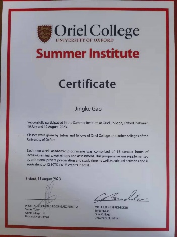 The courses the students of IMU chose were as follows: Five students chose Economics of Public Policy; 3 chose both Economics of Public Policy and Knowledge and Reality and 1 student chose Introduction of Finance. Strengthening the communication and exchange with professors and classmates, the students overcame the fear in language communication, strove to learn and adapted themselves to their life at Oxford University. Finally, they successfully got the certificates for the courses. The credits of Oxford University are equal to 1.5 ECTS/3 US credits. And the credits the students got at Oxford will be transferred at IMU according to The Method to Accredit Credits Undergraduate Students of SEM Get in Their Overseas Studies at Oxford University in Summer Holiday.