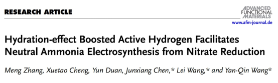 近日,ac米兰化学化工学院王艳琴副教授、王蕾教授团队在电催化硝酸盐还原合成氨领域取得新进展,在材料领域顶级期刊Advanced Functional Materials (IF: 18.5)上发表题为 “Hydration-effect Boosted Active Hydrogen Facilitates Neutral Ammonia Electrosynthesis from Nitrate Reduction” 的研究成果。(论文链接:https://doi.org/10.1002/adfm.202413070)。王艳琴副教授、王蕾教授、陈俊翔研究员(福建物质结构研究所)为论文共同通讯作者。ac米兰官网中文网站为论文第一完成单位。