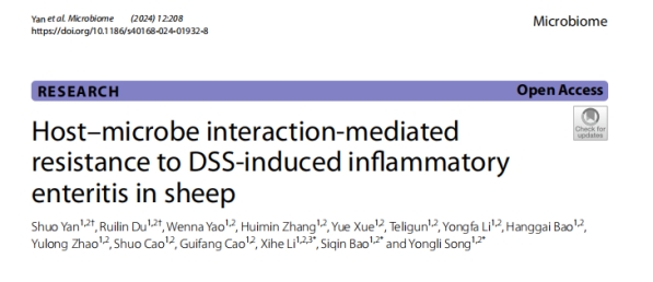 10月21日,ac米兰生命科学学院李喜和、包斯琴、宋永利团队在国际微生物组顶级期刊《Microbiome》(IF=13.8,中科院一区Top期刊)在线发表题为“Host-microbe interaction-mediated resistance to DSS-induced inflammatory enteritis in sheep”的最新研究成果。该研究首次报道了湖羊和东弗里生之间抗病能力差异机制。