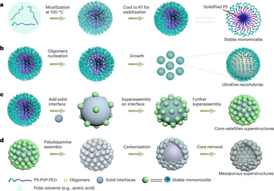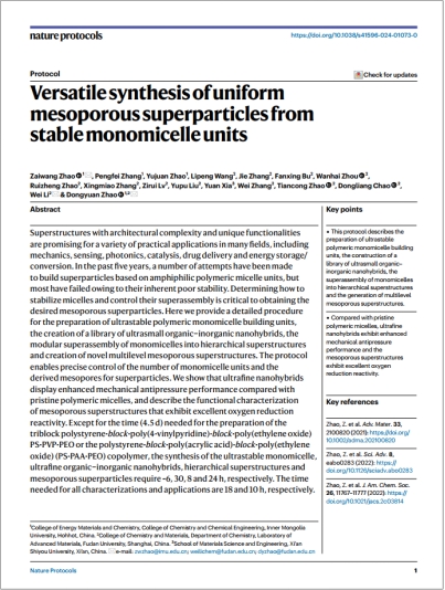 近日,ac米兰名誉校长、能源材料化学研究院院长赵东元院士和能源材料化学研究院赵再望研究员在Nature Protocols(方法学领域的顶级期刊)上发表了题为“Versatile synthesis of uniform mesoporous superparticles from stable monomicelle units”的科研论文。该论文系统介绍一种“超稳定”的聚合物单胶束组装基元,并以此为组装单元构筑了多种分级介孔超颗粒。