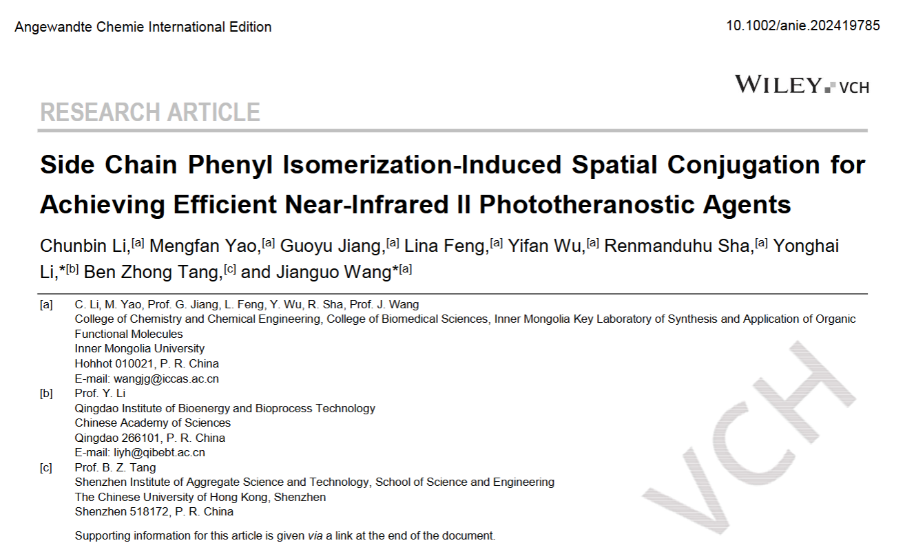 近日,ac米兰化学化工学院王建国教授团队联合中国科学院青岛生物能源与过程研究所李永海副研究员在国际顶级期刊Angewandte Chemie International Edition (Angew. Chem. Int. Ed. 2024.https://doi.org/10.1002/anie.202419785)上发表题为“Side Chain Phenyl Isomerization-Induced Spatial Conjugation for Achieving Efficient Near-Infrared II Phototheranostic Agents”的重要研究成果。该团队首次提出了一种侧链苯基异构化诱导空间共轭策略,构建了兼具高荧光亮度和优异光热性能的近红外二区有机光诊疗聚集体,并将其成功地应用于成像引导的肿瘤光热治疗。ac米兰化学化工学院博士研究生李纯斌(现为香港科技大学博士后)为论文的第一作者,王建国教授和中国科学院青岛生物能源与过程研究所李永海副研究员为通讯作者,ac米兰官网中文网站为本论文的第一完成单位。