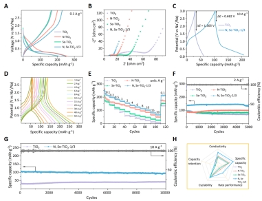 锐钛矿TiO2具有钠化电压适宜、储量丰富以及结构稳定等优点,是潜在的钠离子电池(SIB)负极材料。然而,TiO2存在导电性差和Na+在其晶格内部迁移速率缓慢的不足。文章提出通过N和Se双掺杂策略改善TiO2的储钠性能。DFT计算结果表明N掺杂能够提高TiO2的导电性,Se掺杂能够促进Na+在TiO2晶格内部的扩散,二者协同作用可实现TiO2电化学性能的全面提升。特别是,N和Se掺杂原子百分比为1:3的TiO2电化学性能提升显著。基于DFT计算,通过简单的一锅法合成了N和Se双掺杂锐钛矿TiO2纳米颗粒,电化学测试证实N和Se掺杂原子百分比为1:3的锐钛矿TiO2表现出最优异的性能。