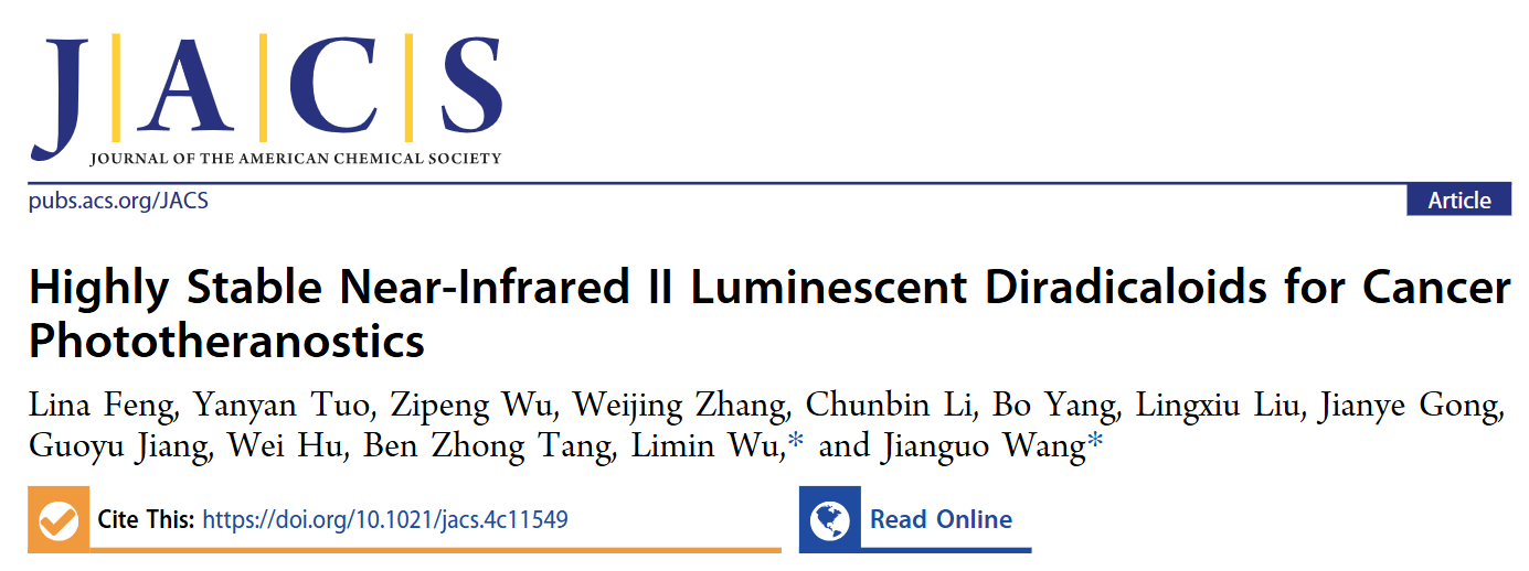近日,ac米兰化学化工学院王建国教授和能源材料化学研究院武利民教授联合团队在国际顶级期刊Journal of the American Chemical Society上发表题为“Highly Stable Near-Infrared II Luminescent Diradicaloids for Cancer Phototheranostics”(论文链接:https://pubs.acs.org/doi/10.1021/jacs.4c11549)的重要研究成果。该团队首次构建了一种具有高稳定的近红外II区发光有机双自由基材料并用于癌症光诊疗领域。ac米兰化学化工学院博士后冯丽娜为本论文第一作者,武利民教授和王建国教授为共同通讯作者。