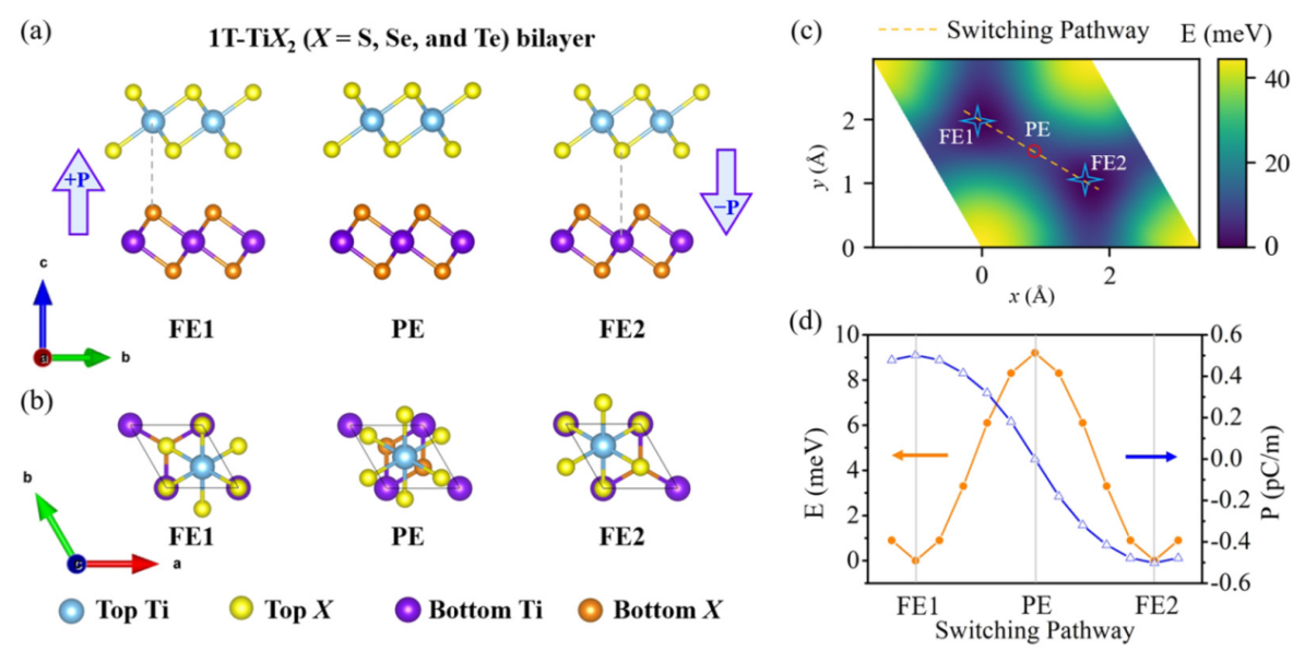 (a) 两个能量简并铁电 (FE1和FE2) 相和一个顺电 (PE) 相的侧视图和 (b) 俯视图。蓝色 (黄色) 和紫色 (橙色) 球分别代表顶层和底层的Ti (X) 原子,箭头表示极化方向。(c) 1T-TiS2双层的势能面。铁电切换路径用橙色虚线标记。以底层1T-TiS2单层为参考,x和y表示顶部1T-TiS2单层在实空间中的相对位移。(d) 1T-TiS2双层极化翻转路径上的能垒 (橙线) 和极化(蓝线)。