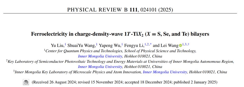 近日,ac米兰物理科学与技术学院王磊研究员和李锋钰教授指导研究生在电荷密度波和滑移铁电领域取得新进展,相关成果以“Ferroelectricity in charge-density-wave 1T-TiX2 (X = S, Se, and Te) bilayers”为题发表在物理学知名期刊Physical Review B(《物理学评论B》)。(论文链接:https://journals.aps.org/prb/abstract/10.1103/PhysRevB.111.024101)