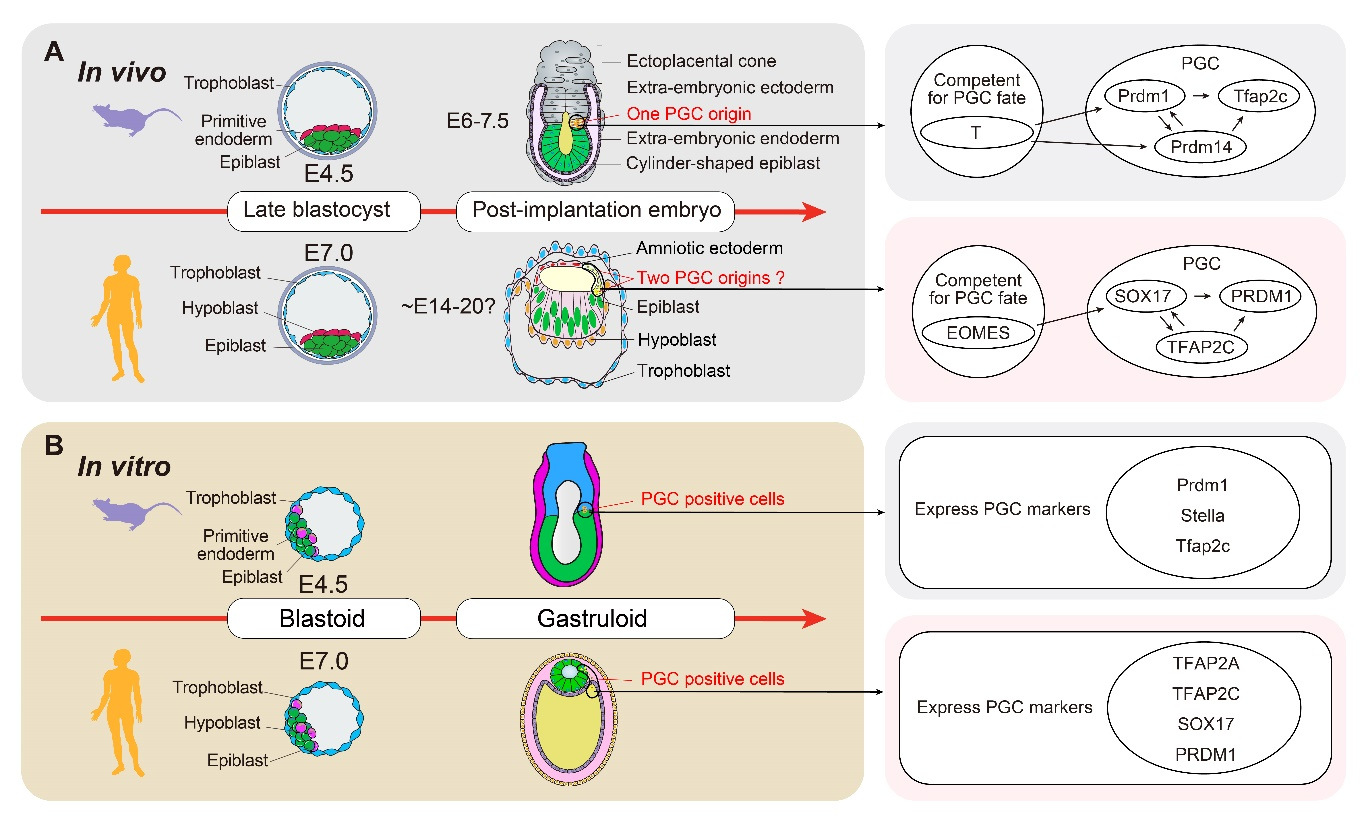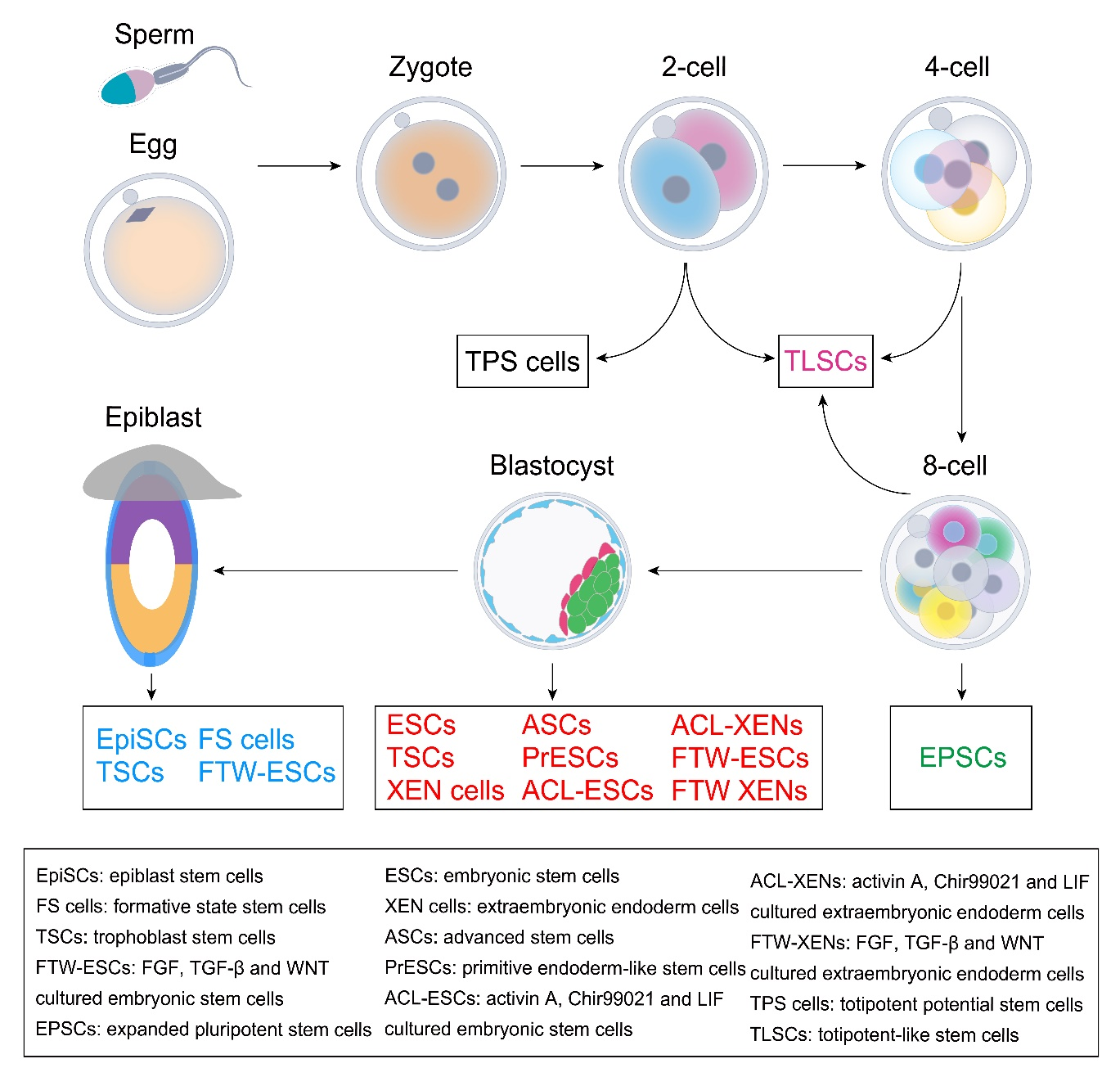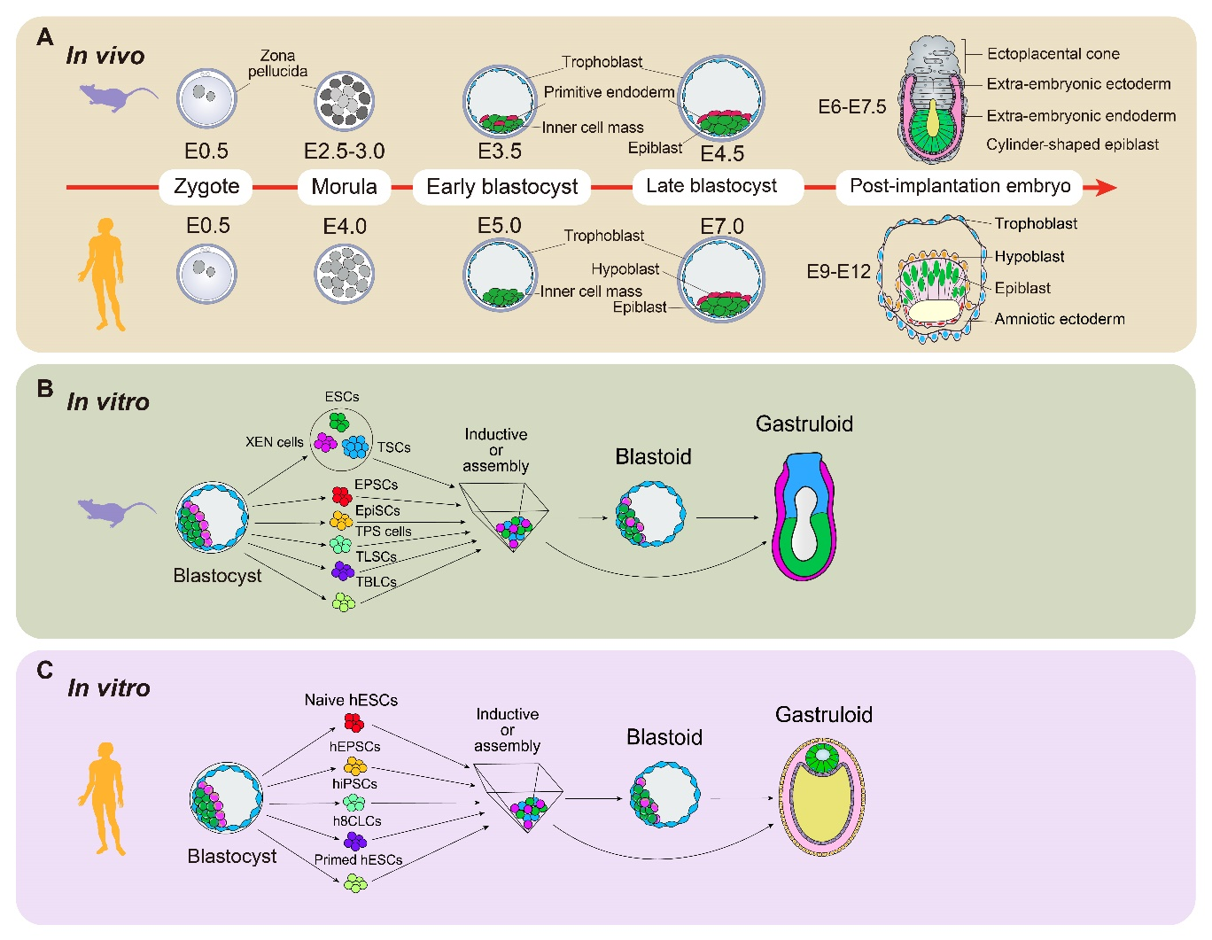 哺乳动物受精卵如何获得全能性并发育成完整的个体是一个古老而又复杂的科学问题。由于胚胎资源有限、技术挑战和伦理等问题,人类早期胚胎发育研究受到一定的障碍。因此,人类早期胚胎发育的精确调控机制仍未清楚。近年来,基于干细胞的胚胎模型(SCBEM)的出现为体外重建植入前、后的胚胎发育的研究提供了实验材料。这些模型在某种程度上模拟了胚胎早期发育的形态和转录特征,可用于研究哺乳动物植入前、后发育阶段胚胎的关键事件。哺乳动物胚胎发生始于精子卵子结合受精后的全能性配子,涉及基因组和表观遗传组等一系列生物学过程的调控。在胚胎发育早期阶段,胚胎细胞数量逐渐增加,而胚胎的体积保持不变。当胚胎发育到囊胚阶段,卵裂球系谱分化形成滋养外胚层(TE)和内细胞团(ICM)。ICM进一步分化形成多能外胚层(EPI)和原始内胚层(PrE)。尽管发育时间和一些分子调控机制有所不同,小鼠和人类的胚胎发育遵循相似的谱系特化过程。然而,由于人类胚胎资源有限、存在的技术挑战和伦理等问题的限制,人们对人类早期胚胎发育的了解仍存在很多“黑匣子”。
